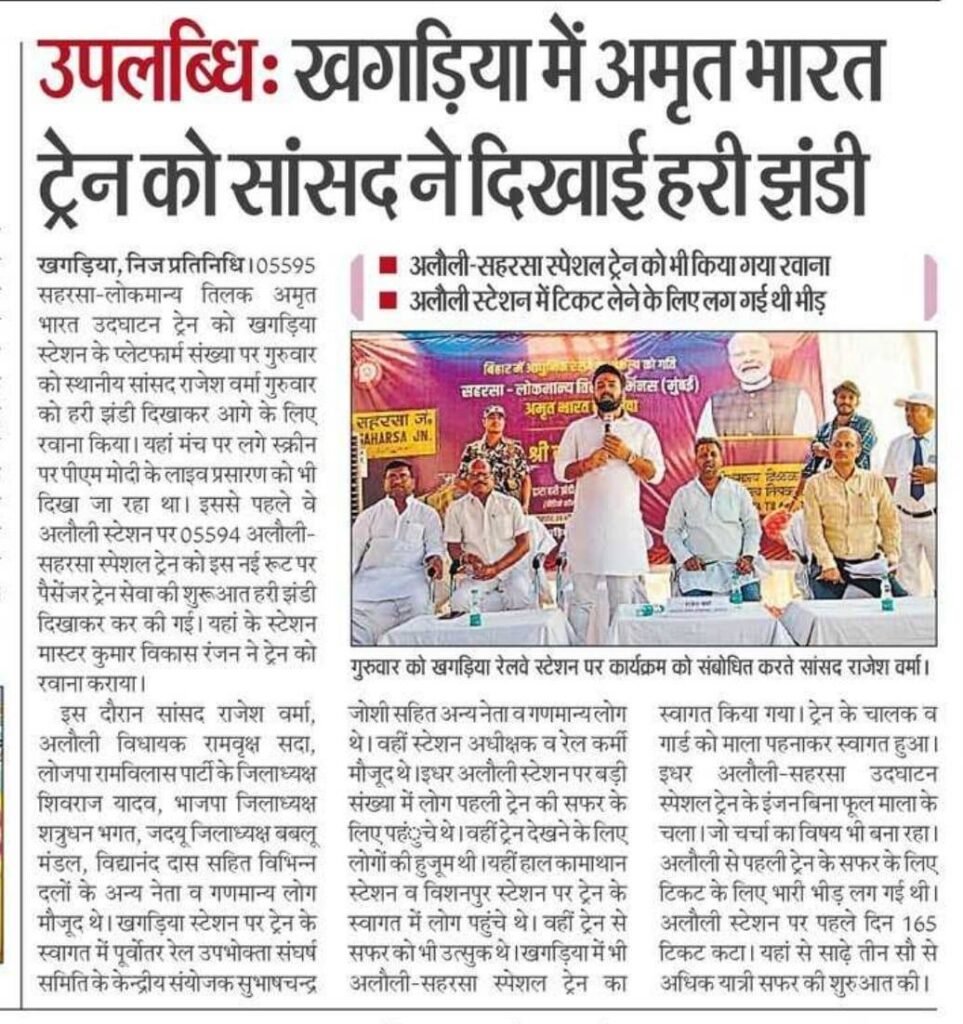 - रेल और परिवहन – रेलवे स्टेशनों का विकास और खगड़िया से नई ट्रेन सेवाओं के प्रयास।