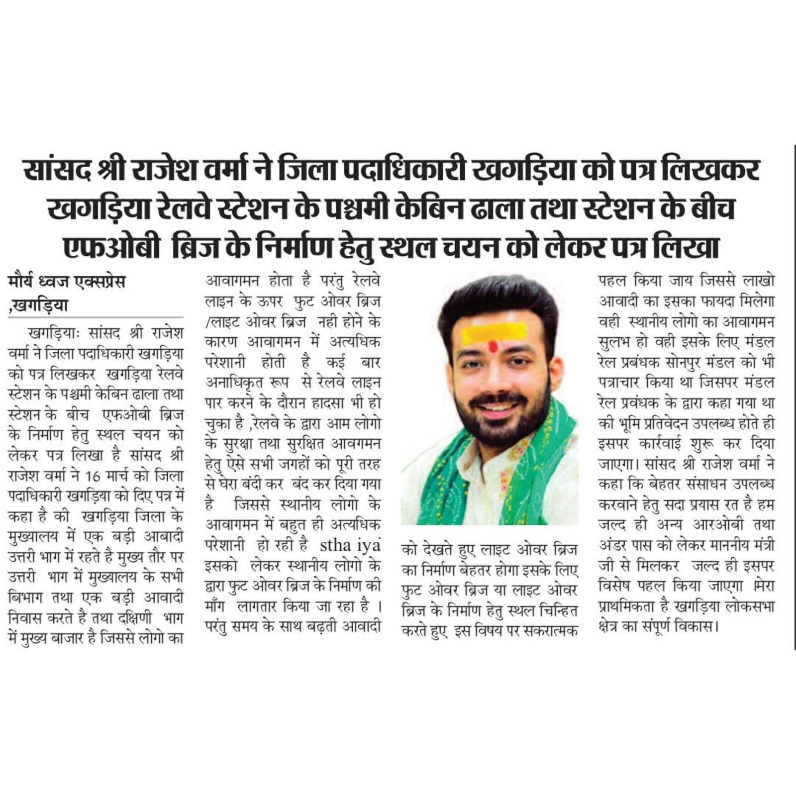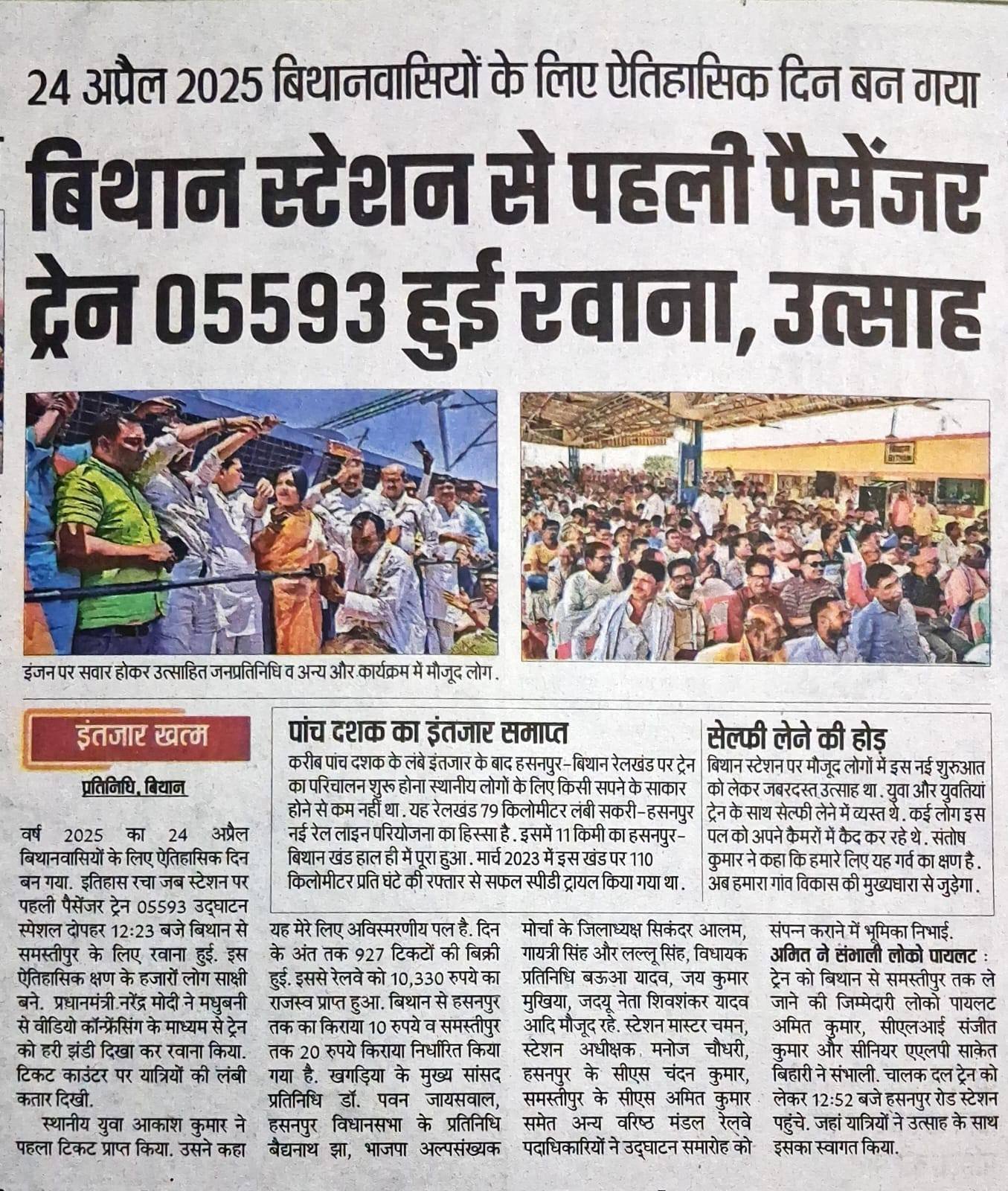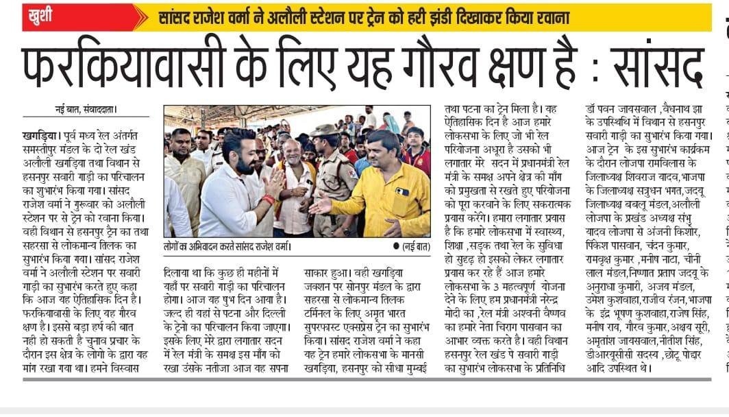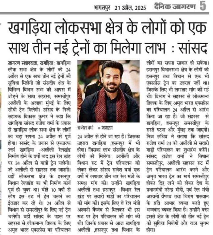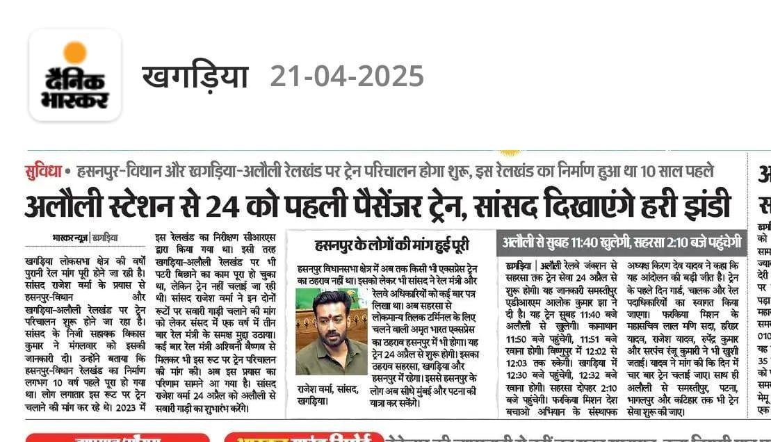 - रेल और परिवहन – रेलवे स्टेशनों का विकास और खगड़िया से नई ट्रेन सेवाओं के प्रयास।