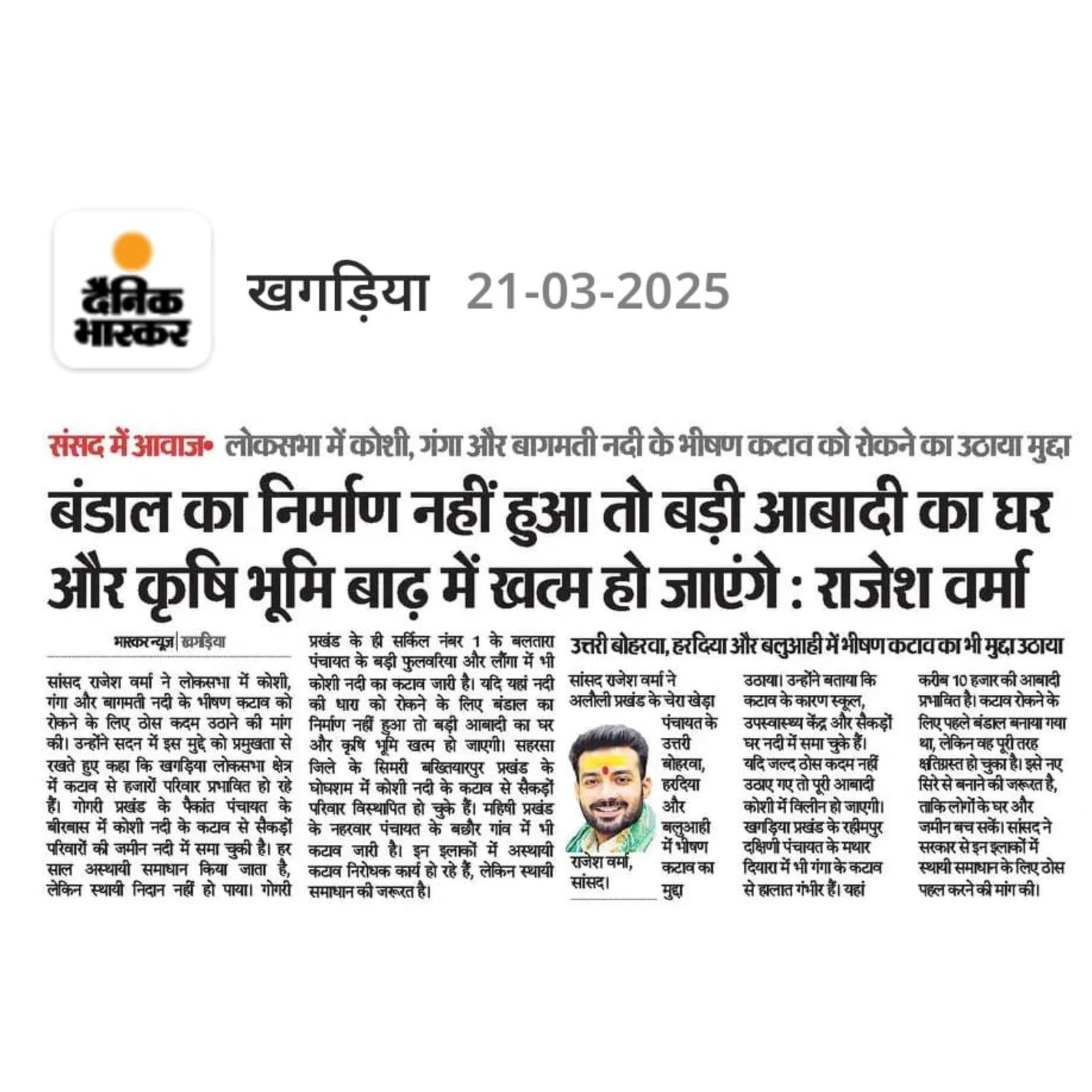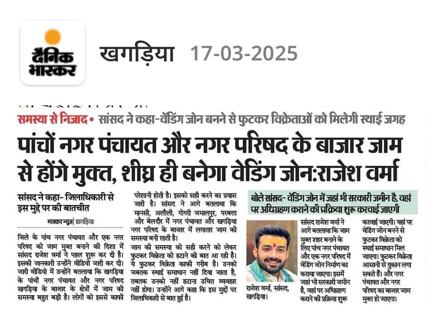आपकी आवाज़ – संसद में मेरे शब्दों में राजेश वर्मा जी ने संसद में खगड़िया की जनता की समस्याओं, आकांक्षाओं और सुझावों को मजबूती से उठाया है। वे न केवल सदन की कार्यवाही में नियमित रूप से भाग लेते हैं, बल्कि कई महत्वपूर्ण विधेयकों और विषयों पर सार्थक हस्तक्षेप भी करते हैं। उनका योगदान जनप्रतिनिधित्व की सच्ची मिसाल है।